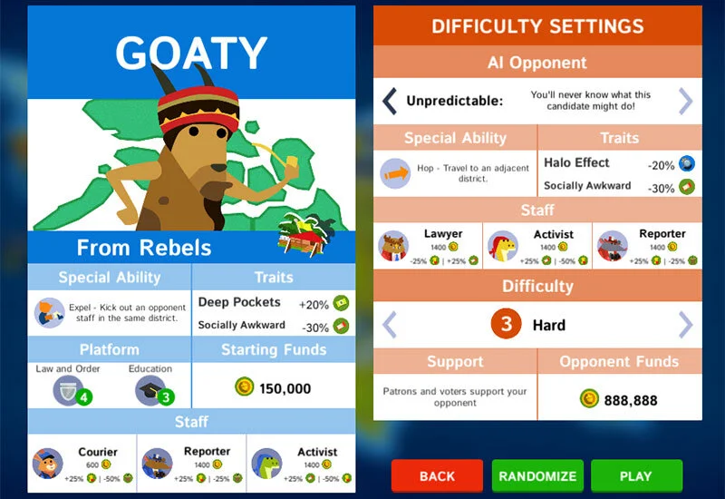 Political Animals is a Third World(developing country) Election Simulator with cute animals! As a presidential candidate for an island of talking animals, the player must use their time and resources wisely to defeat their opponent. The player can run a clean campaign and focus on their platform, or play it dirty by using tactics like bribery, or spreading scandals about their opponent. The game was in development for two years, and was published by Positech Games.